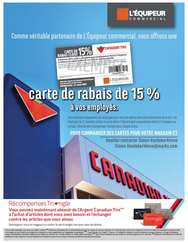 Nous offrons nos cartes d’épargne aux employés de Canadian Tire pour qu’ils puissent les utiliser dans n’importe quel établissement de L’Équipeur au Canada. Ces cartes donneront à l’employé une économie de 15 % sur tous les articles achetés à prix régulier. S’il y a un article en vente, le prix inférieur s’appliquera et ne peut être combiné à aucune autre offre. Triangle Réconpenses sont maintenant admissibles à chaque achat.Il suffit de présenter la carte au point de vente pour recevoir les économies de 15%